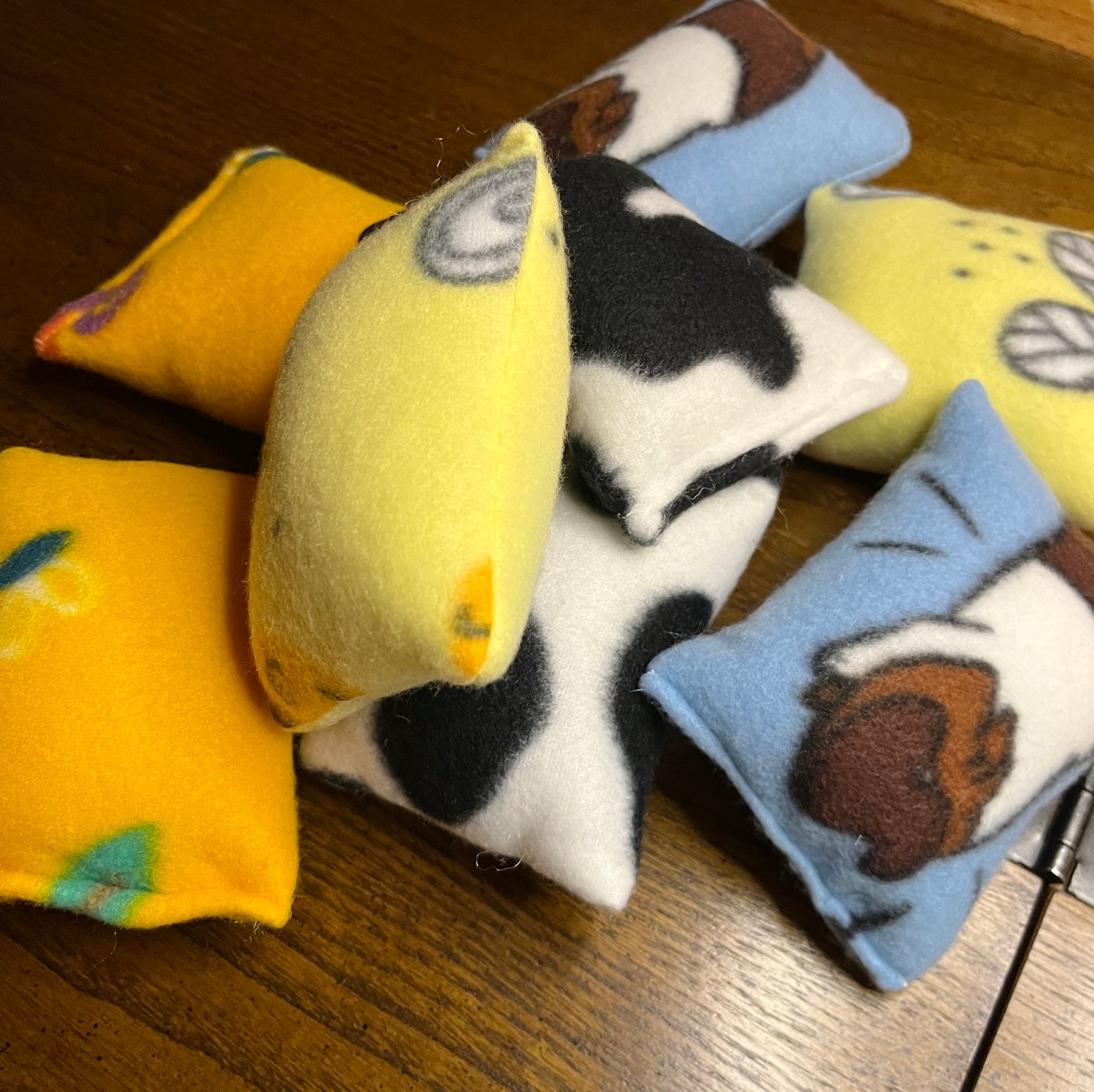 This bundle includes four mystery small Piggy Pillows. They will almost always be rectangular shaped, and they are only about 3-4 inches long. (Not to be mistaken with our pillow beds, or pillow pads) They are made to scale to act as the perfect size pillow for your Guinea pigs to rest their head. These are great under hidey houses.